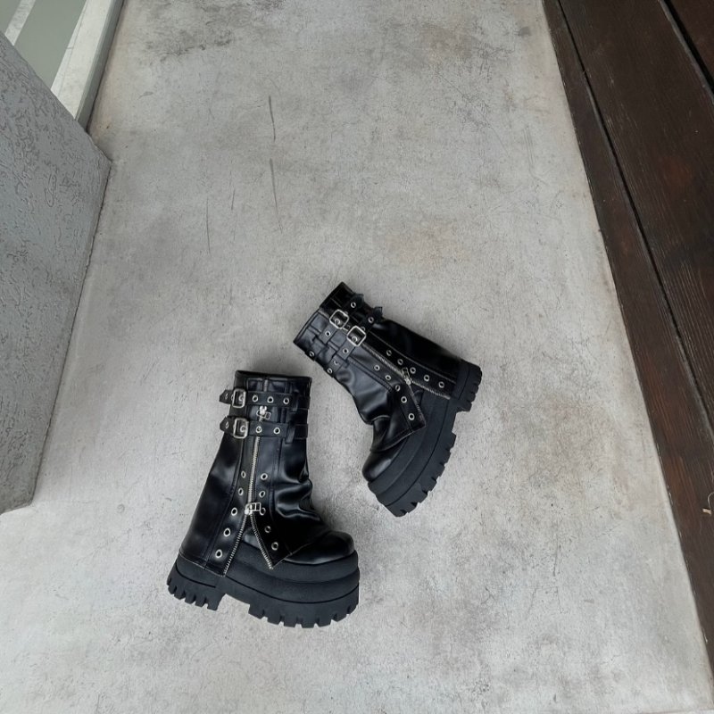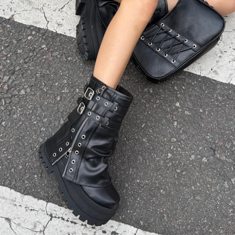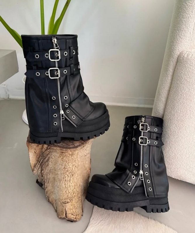 • Altura total: 30cm • Altura da base: 8,5cm • Couro sintético premium com acabamento fosco • Zíper lateral funcional + 2 fivelas ajustáveis • Ilhoses metálicos aplicados nas laterais • Cano médio com estrutura firme